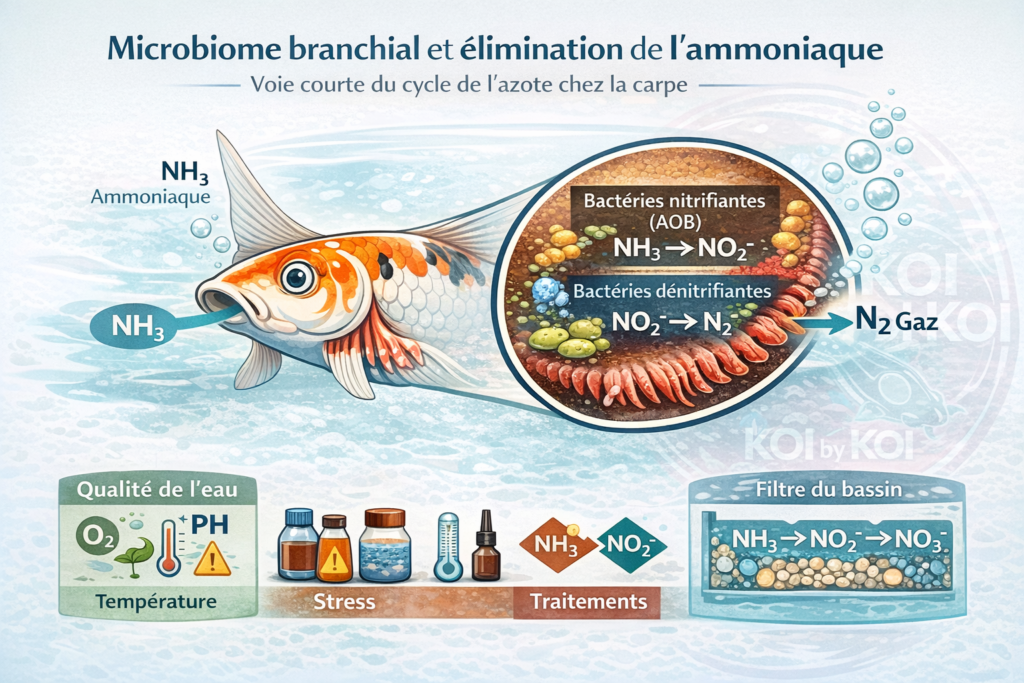 Voici une synthèse scientifique, plus à jour sur les bactéries des branchies impliquées dans l’élimination de l’ammoniaque chez la carpe (et plus largement les téléostéens).